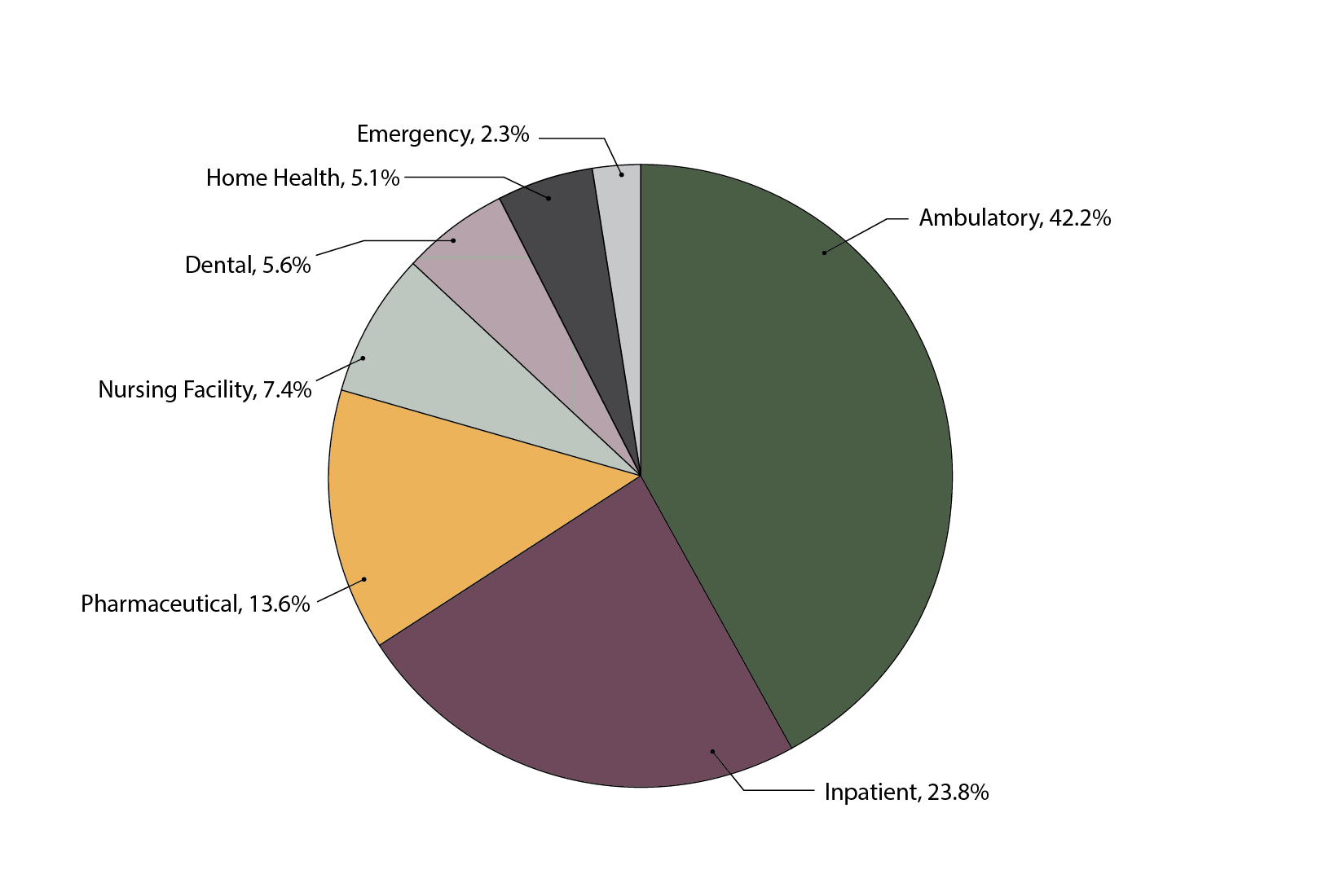 Where the money goes: 42% of spending flowed to outpatient and ambulatory care, or $1.03T. 24%, or $580B, to inpatient hospital services, and 14%, or $13.6B, to pharmaceuticals, with smaller shares for nursing facilities, dental, home health, and emergency departments.